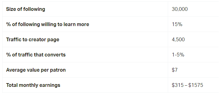 In a 2018 blog, Patreon offered a similar example equation to help you estimate the potential income you might earn from your audience.